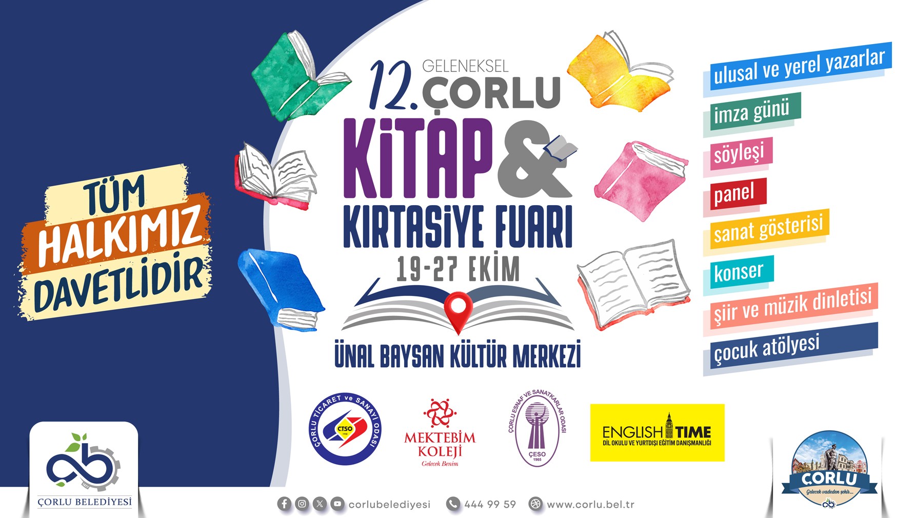 19 – 27 Ekim tarihleri arasında Ünal Baysan Kültür Merkezi’nde gerçekleştirilecek olan 12. Geleneksel Çorlu Kitap ve Kırtasiye Fuarı’nın düzenlenmesinde sundukları desteklerden ötürü Çorlu Ticaret ve Sanayi Odası, Mektebim Koleji, Çorlu Esnaf ve Sanatkârlar Odası ile English Time Dil Okulu ve Yurt Dışı Eğitim Danışmanlığı’na ve diğer sponsorlarımıza ayrıca teşekkür ederim. Sundukları destek ve katkı bizim için çok değerli…