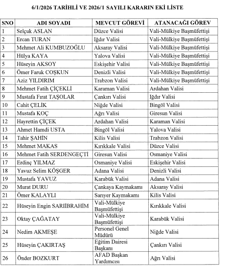 Resmi gazetede yayımlanarak yürürlüğe giren kararnameye göre 26 ilin valisi yer değiştirirken Tekirdağ Valisi Recep Soytürk kararnamede yer almadı.