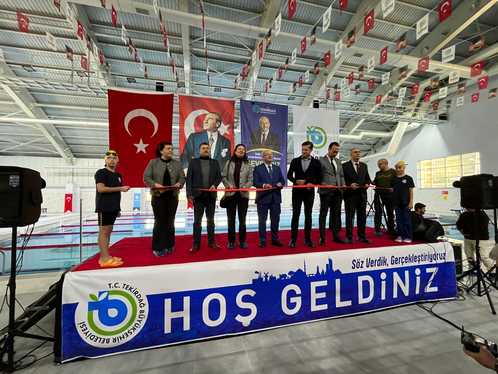 İnsan odaklı hizmet anlayışı ile ulaşımdan altyapıya, sosyal ve kültürel aktivite alanlarından hizmet binalarına kadar her alanda Tekirdağ’ı geleceğe taşıyacak projeleri hayata geçiren Tekirdağ Büyükşehir Belediyesi tarafından vatandaşların spor yapabilmelerine imkân sağlayacak alanlar kazandırmak amacıyla yapımını tamamladığı Çerkezköy Atatürk Yarı Olimpik Yüzme Havuzu düzenlenen törenle hizmete açıldı.