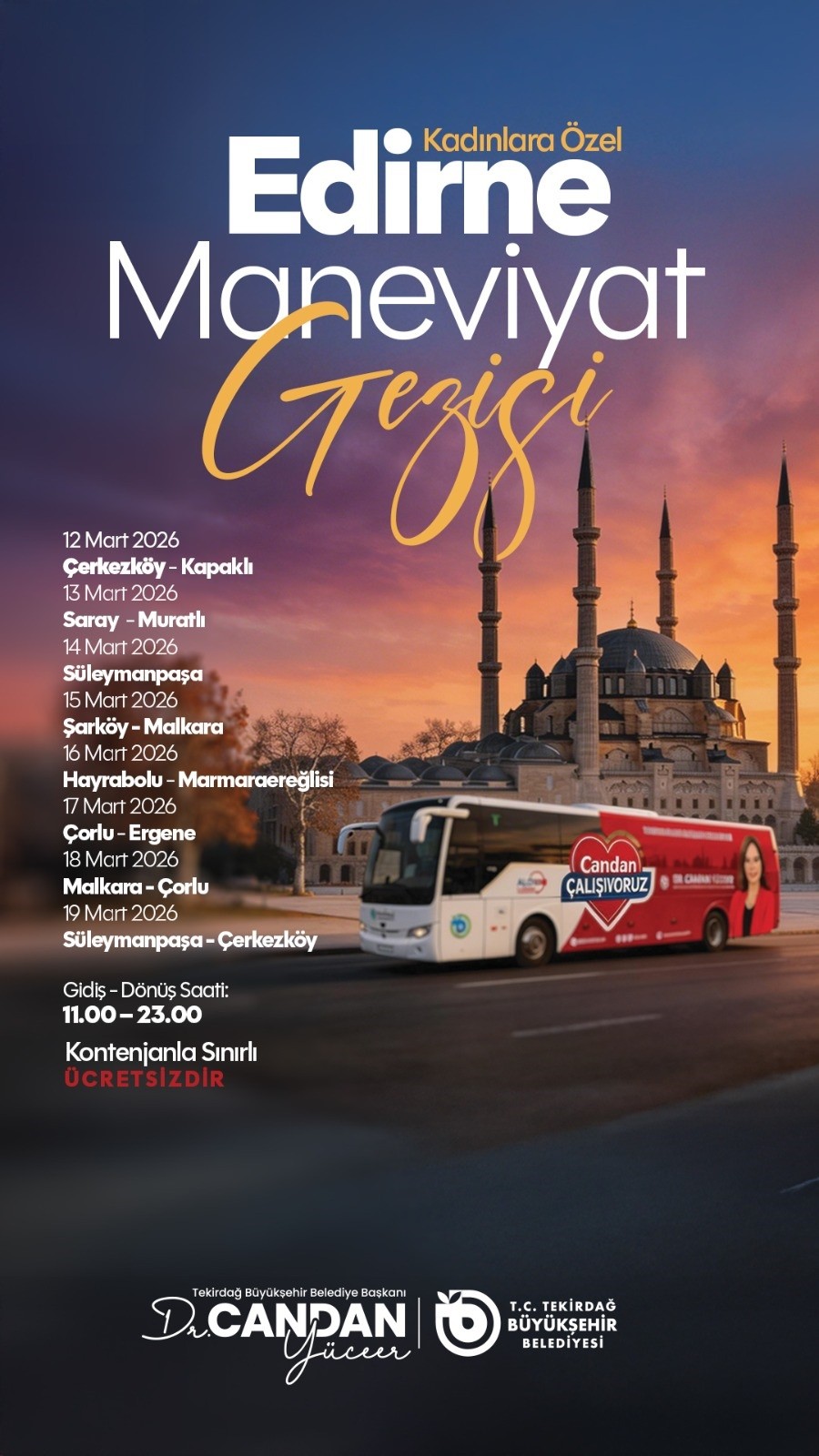 Kontenjanla sınırlı ve ücretsiz olarak gerçekleştirilecek gezi programı, 12-19 Mart tarihleri arasında düzenlenecek. Tekirdağ’ın 11 ilçesinden belirlenen günlerde hareket edecek gezi otobüslerinin kalkış saati 11.00, dönüş saati ise 23.00 olarak belirlendi.