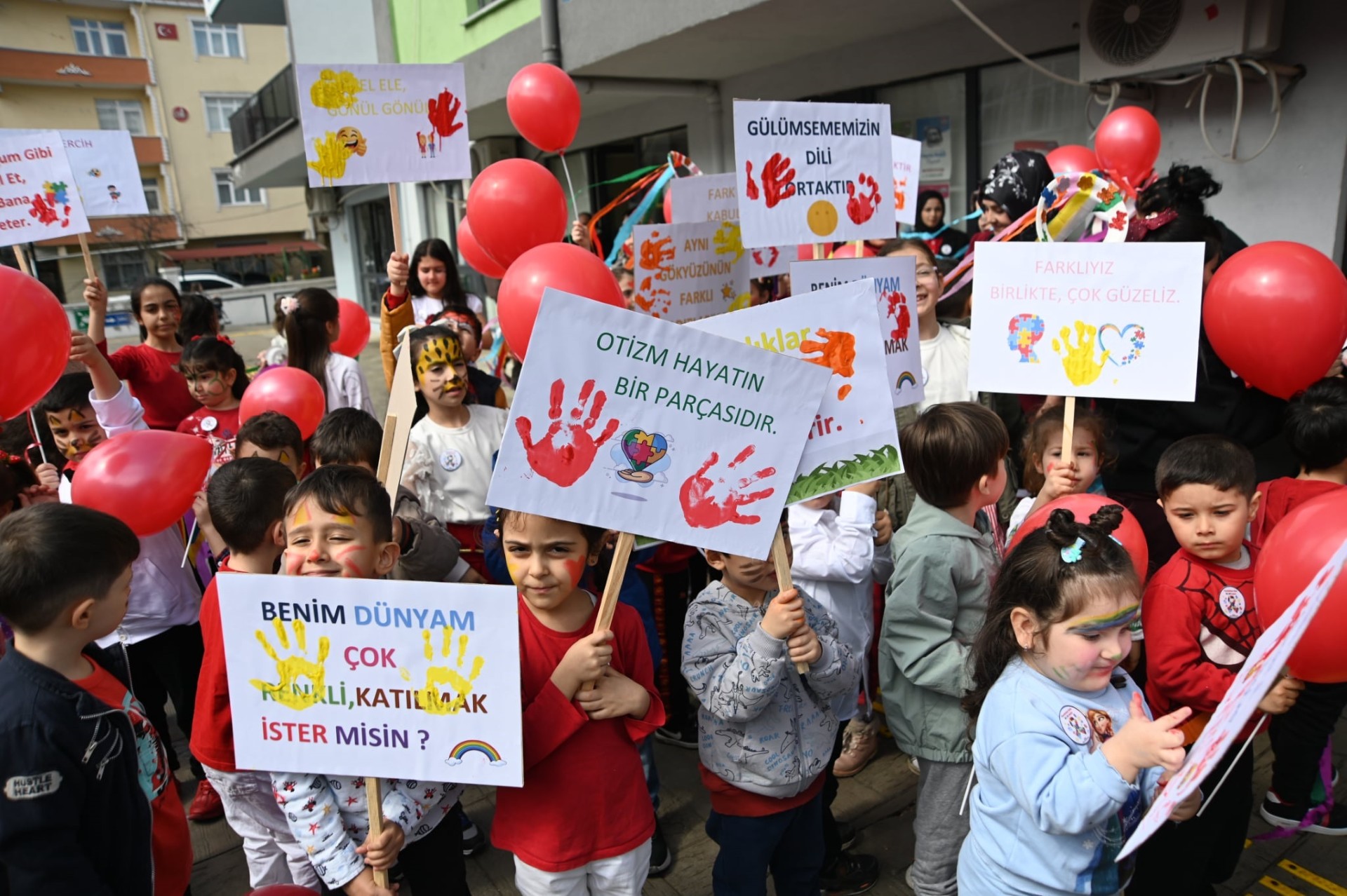 Etkinlikte çocuklar, “Beni olduğum gibi kabul et, bu bana yeter.”, “Otizm, hayatın bir parçasıdır.”, “Benim dünyam çok renkli, katılmak ister misin?” ve “Renklerimiz farklı, kalplerimiz aynı.” vb. yazılı pankart ve dövizlerle farkındalık yürüyüşü gerçekleştirdi.
