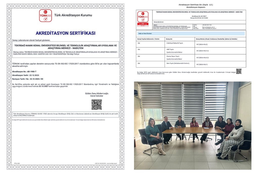 Tekirdağ Namık Kemal Üniversitesi Bilimsel ve Teknolojik Araştırmalar Uygulama ve Araştırma Merkezi (NABİLTEM), Türk Akreditasyon Kurumu (TURKAK) TS EN ISO/IEC 17025:2017 Akreditasyon (Deney ve Kalibrasyon Laboratuvarının Yeterliliği) Belgesi aldı.