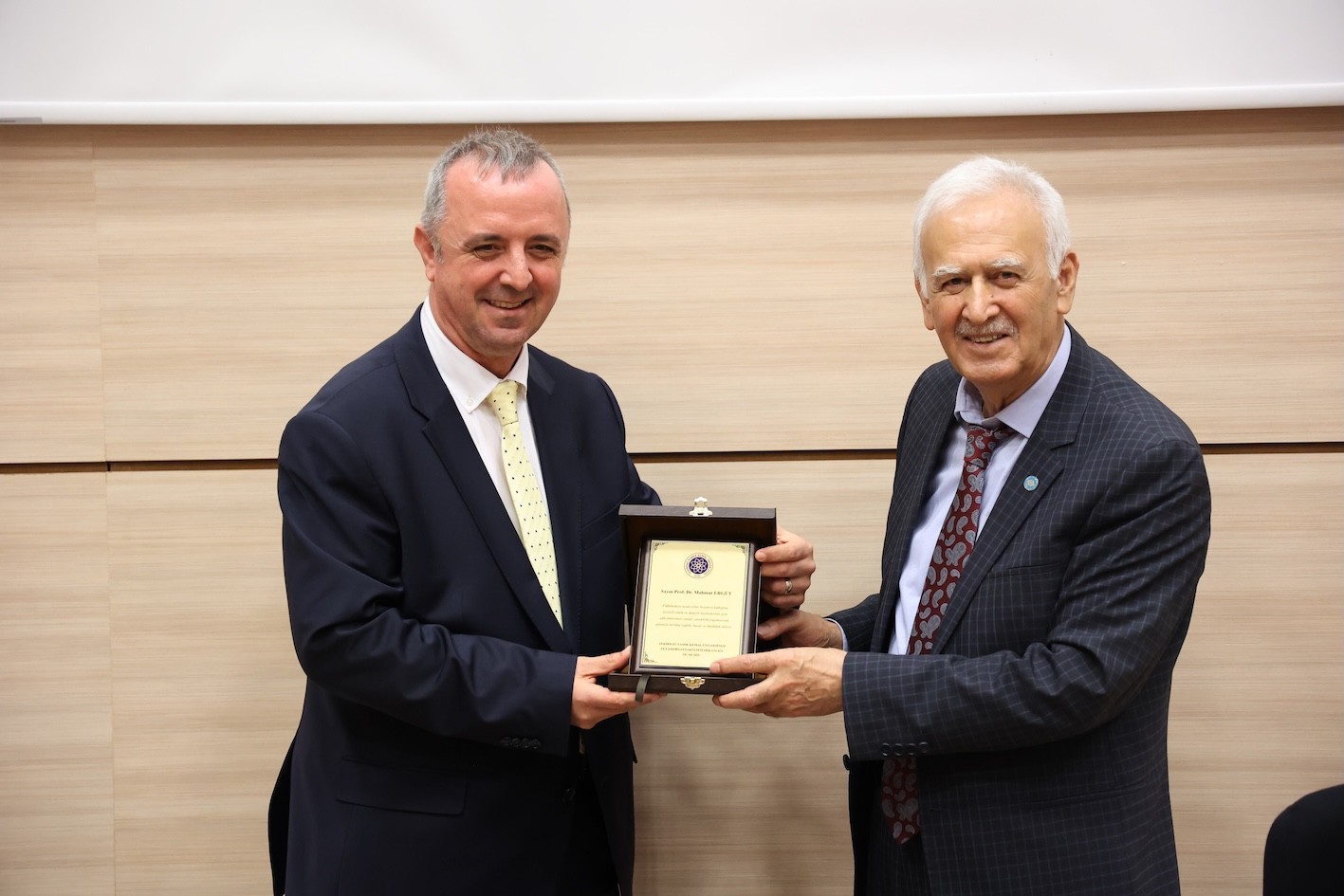 Tören, hizmetlerinden dolayı Prof. Dr. Mahmut Ergüt’e plaket, çiçek ve günün anısına hediye takdim edilmesinin ardından sona erdi