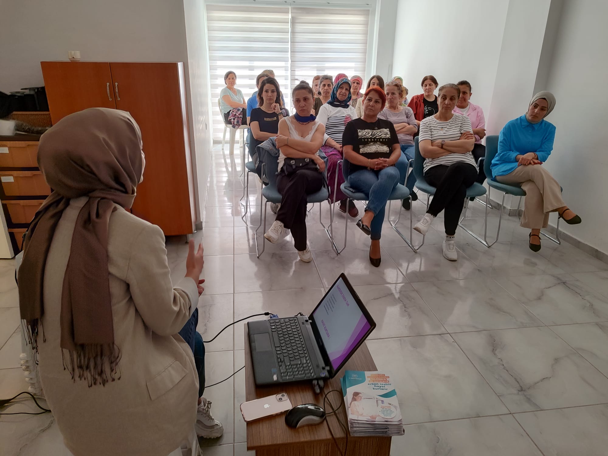 Kanser Erken Teşhis, Tarama ve Eğitim Merkezi (KETEM) Sorumlu Hekimi Dr. Büşra Osmanoğlu Ata, Çiftlikönü sakini hanımlara kanserde erken teşhisin düzenli tarama yaptırmanın önemi konusunda sunum gerçekleştirdi. Dr. Ata’nın ardından Sağlıklı Hayat Merkezi (SAHAM) Uzmanı Hemşire Refiye Egen ise kadınlara Hipertansiyon ve bu hastalığın tuz kullanımı ile ilişkisi konusunda bilgilendirmede bulundu.
