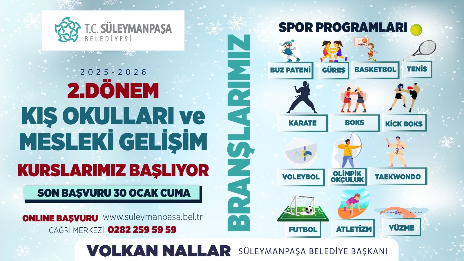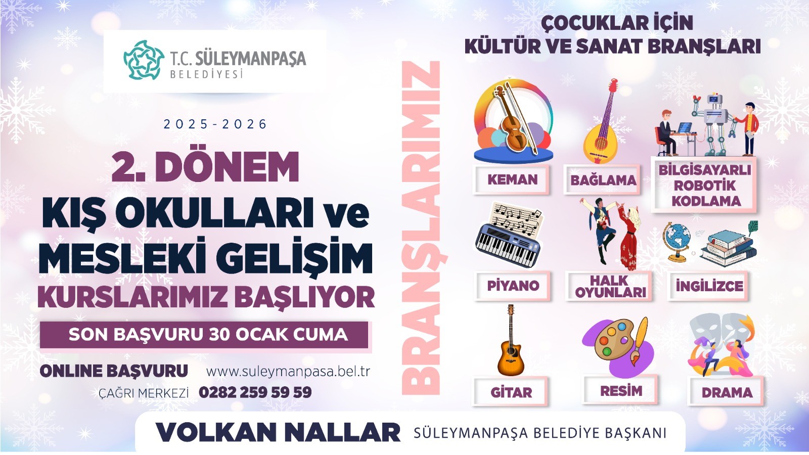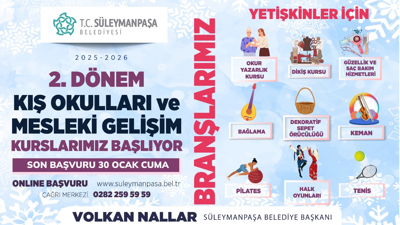 Kış Okulları ikinci dönem kurslarına kayıt yaptırmak isteyen vatandaşlar, Süleymanpaşa Belediyesinin www.suleymanpasa.bel.tr adresli resmi internet sitesi üzerinden başvurularını gerçekleştirebilecek. Kurslar hakkında detaylı bilgi almak isteyenler için 0 282 259 59 59 numaralı Çağrı Merkezi’nden destek verilecek.