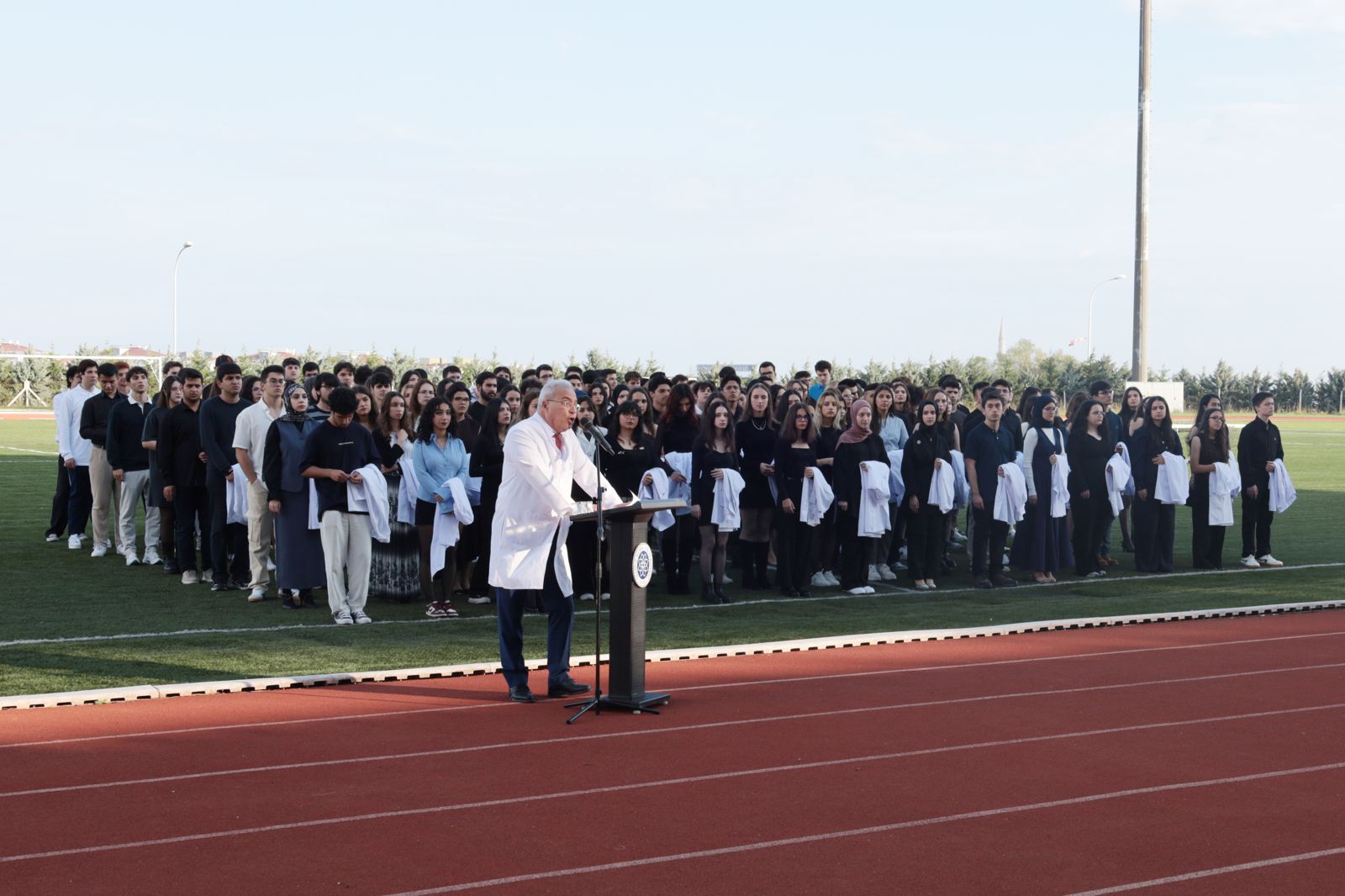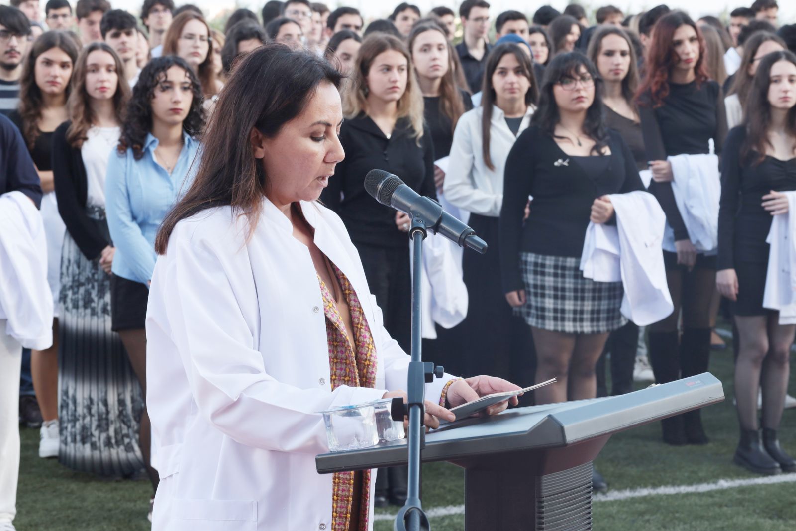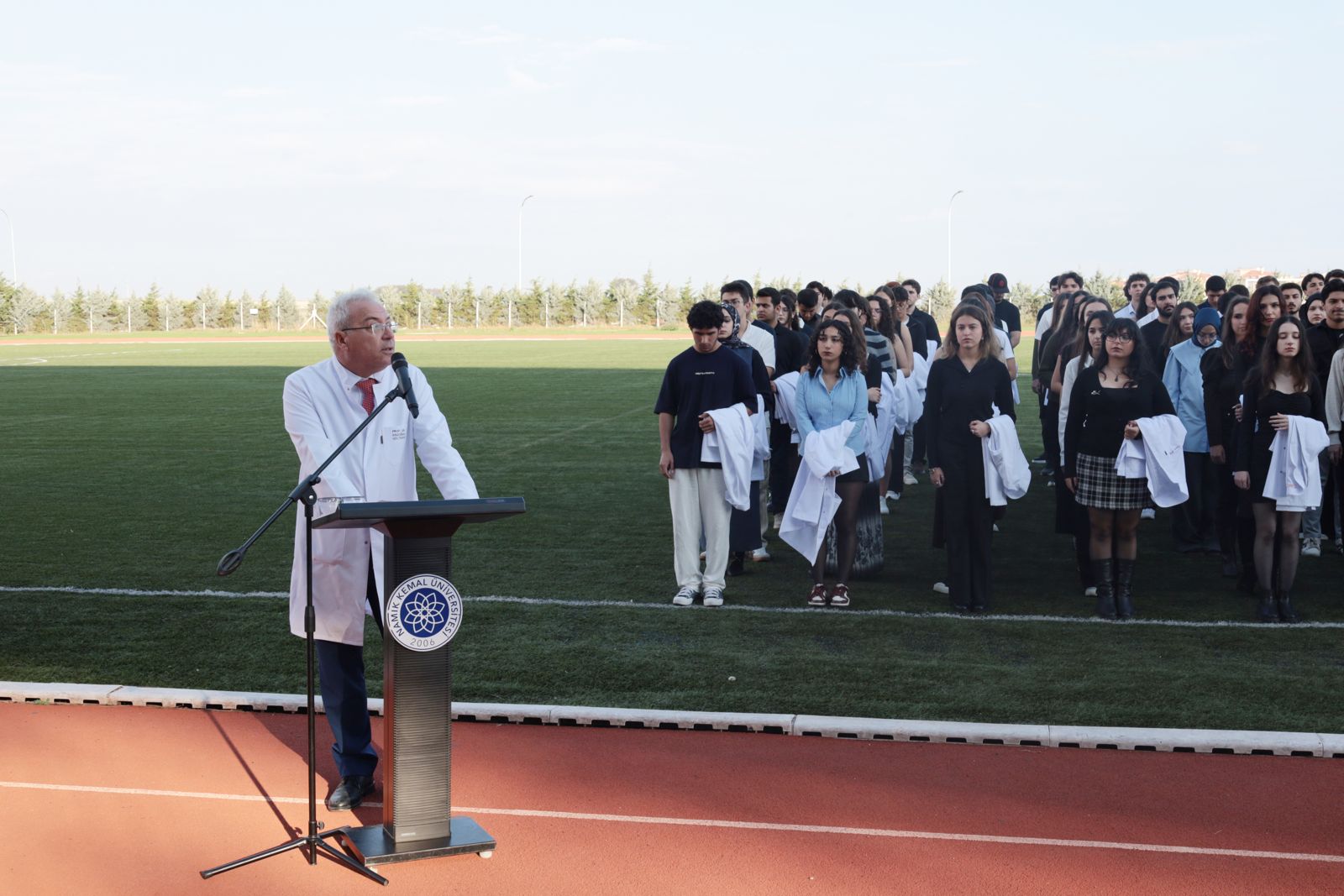 Törende konuşan Tıp Fakültesi Dekanı Prof. Dr. Erdoğan Gültekin, “Beyaz önlük; dürüstlüğün, ahlakın, sorumluluğun ve din, dil, ırk, cinsiyet ayrımı yapmadan tüm insanlara hizmetin sembolüdür. Bugün giydiğiniz önlüğün temsil ettiği vicdani ve insani değerlere daima sahip çıkacaksınız.” ifadelerine yer verdi.