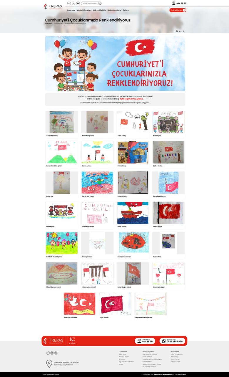 TREPAŞ, düzenlediği “Cumhuriyet’i Çocuklarımızla Renklendiriyoruz” adlı etkinlikle 29 Ekim Cumhuriyet Bayramı coşkusunu çalışanlarının çocuklarıyla paylaştı. Çocukların kendi bakış açısı ve hayal güçlerini kullanarak yaptıkları 29 Ekim Cumhuriyet Bayramı temalı resimlerle, TREPAŞ web sitesinde dijital bir sergi oluşturuldu.